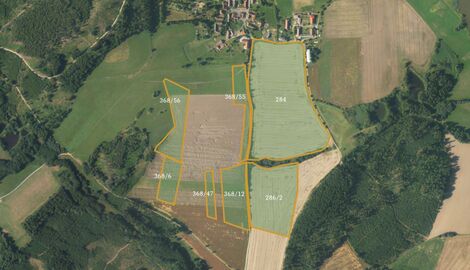 Soubor šesti pozemků zemědělské půdy v katastru Růžená na Vysočině. Tři z nich vedeny jako orná půda a tři jako trvalý travní porost. Všechny…