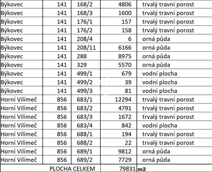 Prodej zemědělských pozemků o celkové výměře 79 831 m2, K.Ú. Býkovec a Horní Vilímeč, Počátky